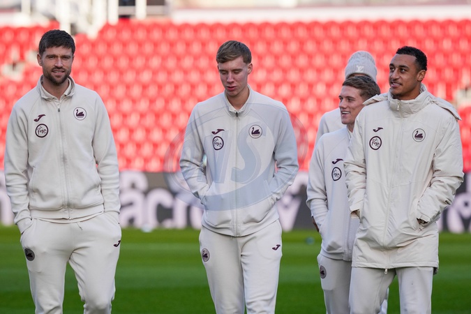 Swansea City players inspect the pitch during the Sky Bet Championship match Stoke City vs Swansea City at Bet365 Stadium, Stoke-on-Trent, United Kingdom, 13th December 2025, Credit:Maynard Manyowa/News Images / Avalon