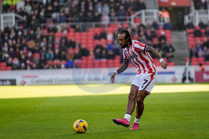 Sorba Thomas of Stoke City passes the ball during the Sky Bet Championship match Stoke City vs Swansea City at Bet365 Stadium, Stoke-on-Trent, United Kingdom, 13th December 2025, Credit:Maynard Manyowa/News Images / Avalon