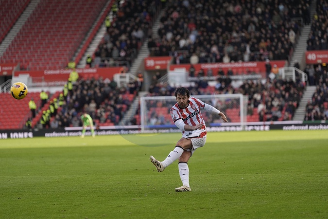 Ben Pearson of Stoke City shoots at goal during the Sky Bet Championship match Stoke City vs Swansea City at Bet365 Stadium, Stoke-on-Trent, United Kingdom, 13th December 2025, Credit:Maynard Manyowa/News Images / Avalon