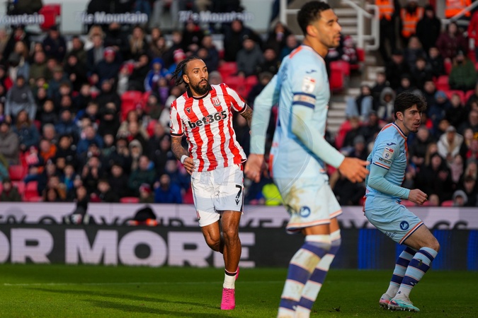 Sorba Thomas of Stoke City looks on after takin g a shot on goal which he scores to make it 2-0 during the Sky Bet Championship match Stoke City vs Swansea City at Bet365 Stadium, Stoke-on-Trent, United Kingdom, 13th December 2025, Credit:Maynard Manyowa/News Images / Avalon