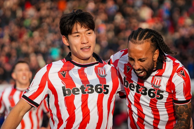 Sorba Thomas of Stoke City celebrates his goal with Bae Jun-Ho of Stoke City to make it 2-0 during the Sky Bet Championship match Stoke City vs Swansea City at Bet365 Stadium, Stoke-on-Trent, United Kingdom, 13th December 2025, Credit:Maynard Manyowa/News Images / Avalon