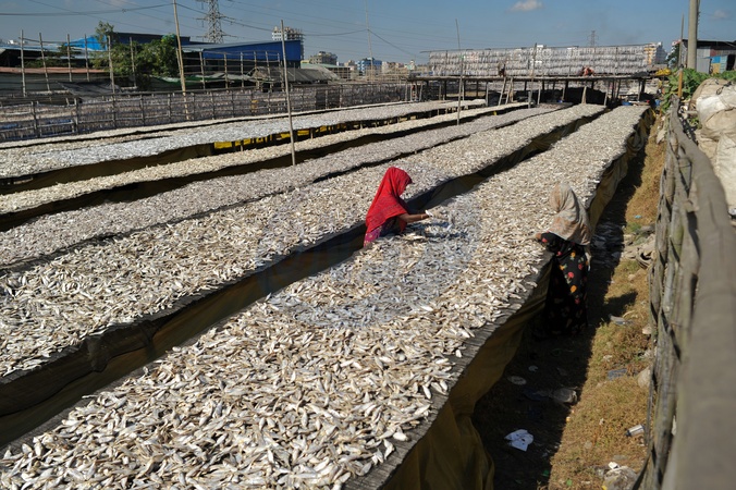 13 December 2025 Chattogram, Bangladesh- Women process fish at an open drying yard in Chattogram, Bangladesh. The fish are cleaned, salted, and sun-dried on bamboo platforms for four to five days, depending on weather conditions. Dry fish processing requires consistent heat and remains a vital food source in Bangladesh, accounting for the fourth-largest share of fish consumption and providing an affordable protein across all income levels. The dried fish are distributed for domestic use and export., Credit:Md Rafayat Haque Khan / Avalon