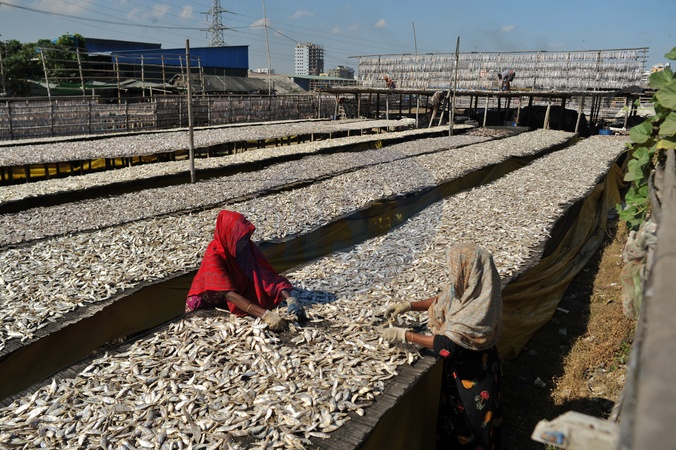 13 December 2025 Chattogram, Bangladesh- Women process fish at an open drying yard in Chattogram, Bangladesh. The fish are cleaned, salted, and sun-dried on bamboo platforms for four to five days, depending on weather conditions. Dry fish processing requires consistent heat and remains a vital food source in Bangladesh, accounting for the fourth-largest share of fish consumption and providing an affordable protein across all income levels. The dried fish are distributed for domestic use and export., Credit:Md Rafayat Haque Khan / Avalon