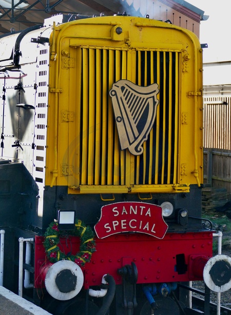 General atmosphere on a sunny day at the Santa Express on The Bunkline at the Cholsey & Wallingford Heritage Railway. Visitors were entertained by Santa's elves, Mother Christmas and would be visited by Father Christmas to receive a present. Before departure adults received a free festive drink and mince pie, and children received a soft drink and a sweet treat from the kiosk. The journey takes approximately an hour travelling through the Oxfordshire countryside and passengers were accompanied throughout by Santa's elves and cheerful team of festive volunteers.The "Guinness train" refers to diesel locomotives, specifically 08 shunters, used at the Cholsey & Wallingford Railway, a heritage line in Oxfordshire, England, that once served the Guinness brewery. These yellow and black industrial shunters, like the famous "Lion" (08022), were acquired from the Park Royal brewery and now run special steam and diesel heritage days for enthusiasts, offering short, scenic trips connecting Cholsey to Wallingford., Credit:Geoffrey Swaine / Avalon