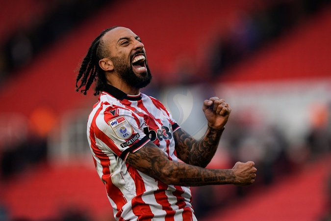 Sorba Thomas of Stoke City celebrates his team winning 2-1 during the Sky Bet Championship match Stoke City vs Swansea City at Bet365 Stadium, Stoke-on-Trent, United Kingdom, 13th December 2025, Credit:Maynard Manyowa/News Images / Avalon