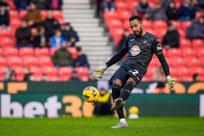 Lawrence Vigouroux of Swansea City kicks the ball during the Sky Bet Championship match Stoke City vs Swansea City at Bet365 Stadium, Stoke-on-Trent, United Kingdom, 13th December 2025, Credit:Maynard Manyowa/News Images / Avalon