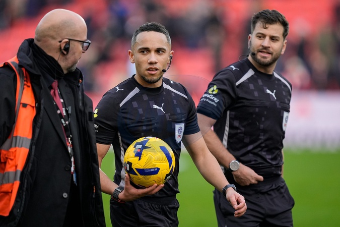 Referee Ruebyn Ricardo is escorted off the pitch at full time during the Sky Bet Championship match Stoke City vs Swansea City at Bet365 Stadium, Stoke-on-Trent, United Kingdom, 13th December 2025, Credit:Maynard Manyowa/News Images / Avalon