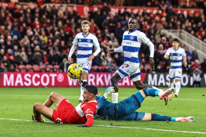 Queens Park Rangers goalkeeper Paul Nardi blocks a shot from David Strelec of Middlesbrough during the Sky Bet Championship match Middlesbrough vs Queens Park Rangers at Riverside Stadium, Middlesbrough, United Kingdom, 13th December 2025, Credit:Ae Cosgrove/News Images / Avalon