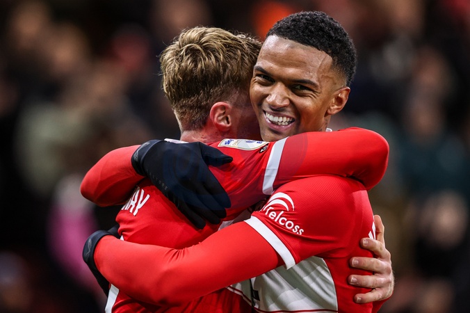 Tommy Conway of Middlesbrough celebrates his goal to make it 3-0 during the Sky Bet Championship match Middlesbrough vs Queens Park Rangers at Riverside Stadium, Middlesbrough, United Kingdom, 13th December 2025, Credit:Ae Cosgrove/News Images / Avalon