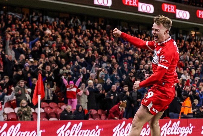 Tommy Conway of Middlesbrough celebrates his goal to make it 3-0 during the Sky Bet Championship match Middlesbrough vs Queens Park Rangers at Riverside Stadium, Middlesbrough, United Kingdom, 13th December 2025, Credit:Ae Cosgrove/News Images / Avalon