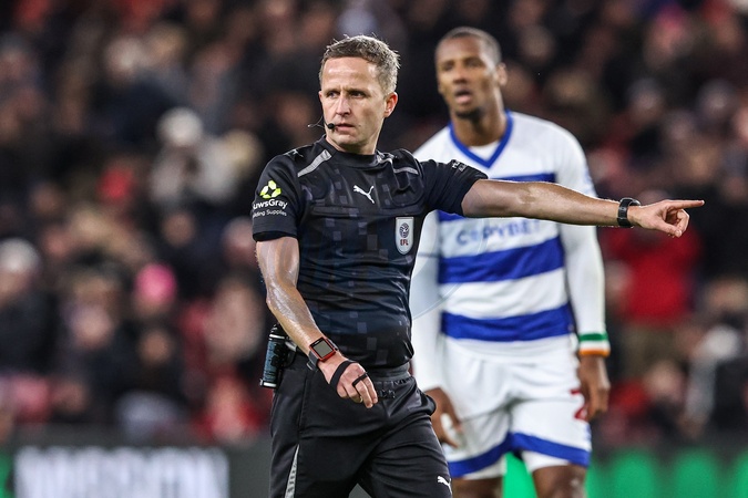 Referee Josh Smith points to the penalty spot for Middlesbrough during the Sky Bet Championship match Middlesbrough vs Queens Park Rangers at Riverside Stadium, Middlesbrough, United Kingdom, 13th December 2025, Credit:Ae Cosgrove/News Images / Avalon