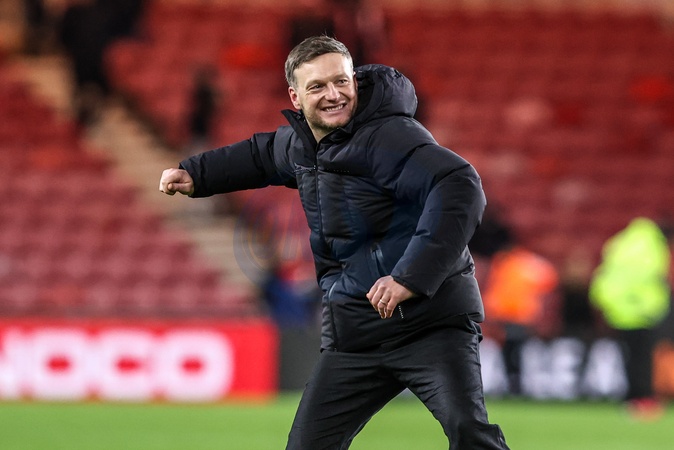 Kim Hellberg manager of Middlesbrough celebrates the win with the fans after the game during the Sky Bet Championship match Middlesbrough vs Queens Park Rangers at Riverside Stadium, Middlesbrough, United Kingdom, 13th December 2025, Credit:Ae Cosgrove/News Images / Avalon