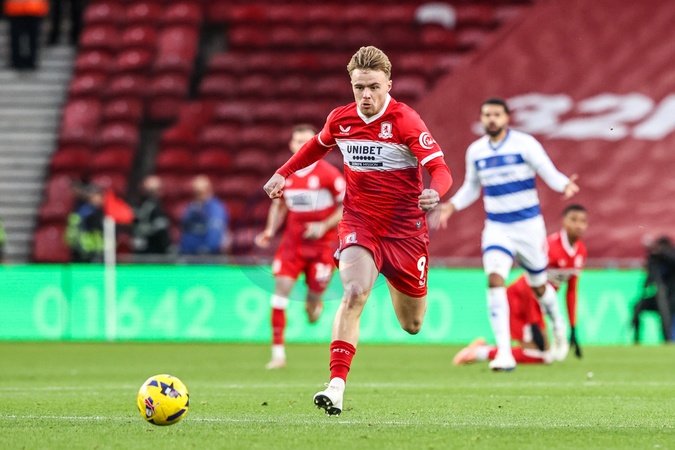 Tommy Conway of Middlesbrough breaks with the ball during the Sky Bet Championship match Middlesbrough vs Queens Park Rangers at Riverside Stadium, Middlesbrough, United Kingdom, 13th December 2025, Credit:Ae Cosgrove/News Images / Avalon