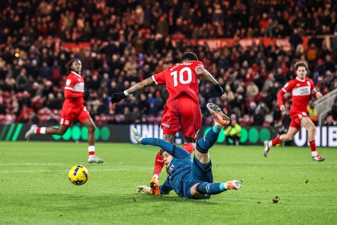 Queens Park Rangers goalkeeper Paul Nardi takes the ball from the feet of Delano Burgzorg of Middlesbrough during the Sky Bet Championship match Middlesbrough vs Queens Park Rangers at Riverside Stadium, Middlesbrough, United Kingdom, 13th December 2025, Credit:Ae Cosgrove/News Images / Avalon