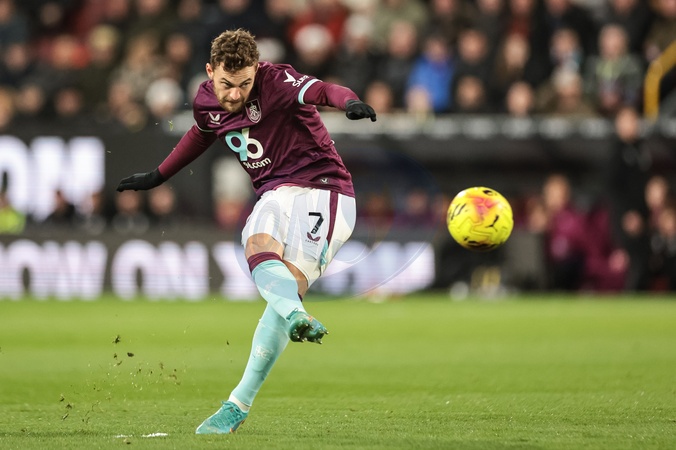 Jacob Bruun Larsen of Burnley takes a free kick, rebound off the wall during the Premier League match Burnley vs Fulham at Turf Moor, Burnley, United Kingdom, 13th December 2025, Credit:Mark Cosgrove/News Images / Avalon