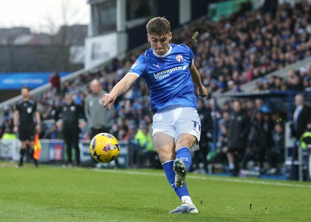 Dylan Duffy of Chesterfield crosses the ball during the Sky Bet League 2 match Chesterfield vs Barnet at SMH Group Stadium, Chesterfield, United Kingdom, 13th December 2025, Credit:Richard Bierton/News Images / Avalon