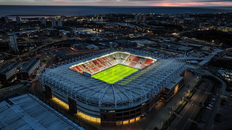 An aerial view of the Stadium Of Light during sunrise ahead of the Premier League match Sunderland vs Newcastle United at Stadium Of Light, Sunderland, United Kingdom, 14th December 2025, Credit:Ae Cosgrove/News Images / Avalon