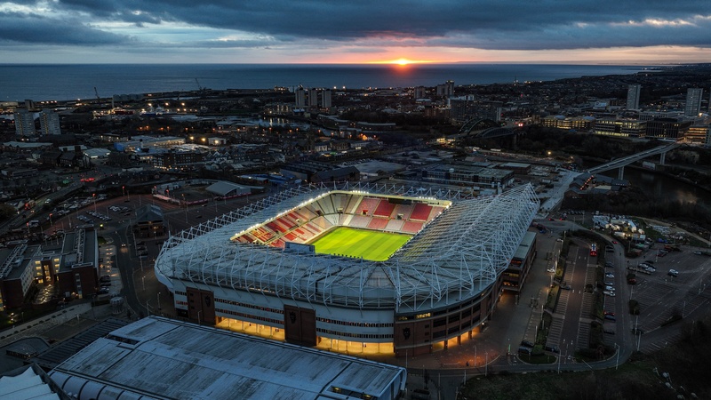 An aerial view of the Stadium Of Light during sunrise ahead of the Premier League match Sunderland vs Newcastle United at Stadium Of Light, Sunderland, United Kingdom, 14th December 2025, Credit:Ae Cosgrove/News Images / Avalon