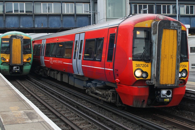 A Southern class 377 and a Gatwick Express class 387 at Clapham Junction, London, UK, 12 December 2025, Credit:Alex Day / Avalon