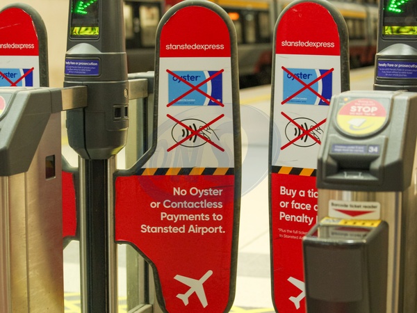 Gateline at London Liverpool Street with signage telling passengers that Oyster or contactless payments can not be used on Great British Railways/Greater Anglia/Stansted Express services to Stansted Airport, London, UK, 13 December 2025, Credit:Alex Day / Avalon