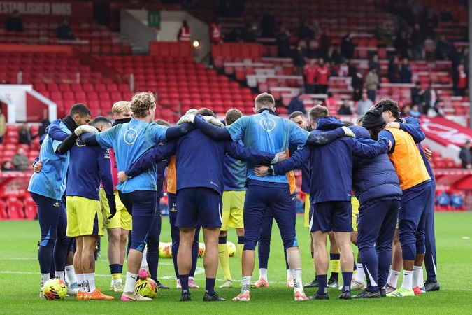 Tottenham team huddle in the pregame warmup session during the Premier League match Nottingham Forest vs Tottenham Hotspur at City Ground, Nottingham, United Kingdom, 14th December 2025, Credit:Mark Cosgrove/News Images / Avalon