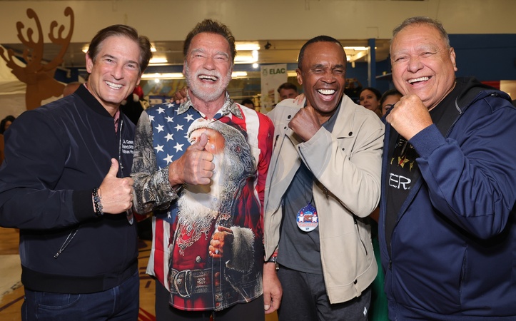 13 December 2025 . Los Angeles, California - District Attorney Nathan Hochman, Arnold Schwarzenegger, Sugar Ray Leonard, Daniel Hernandez At THE 44th Annual "Miracle on 1st Street” Christmas Toy Giveaway held at Hollenbeck Youth Center in Los Angeles., Credit:Sadou Faye / Avalon