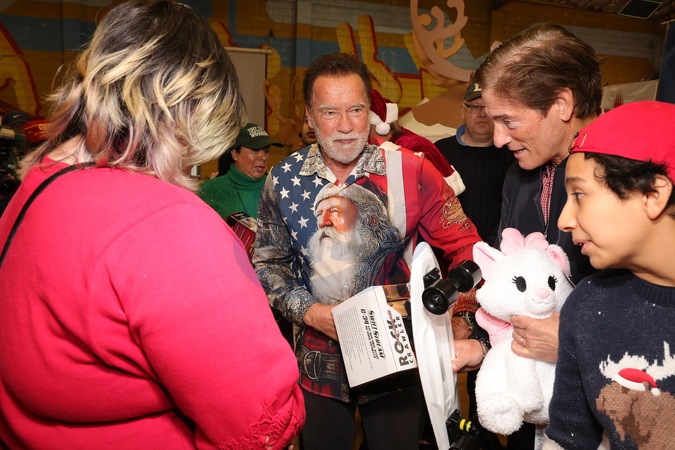 13 December 2025 . Los Angeles, California - Arnold Schwarzenegger, District Attorney Nathan Hochman, Zacky Munoz At THE 44th Annual "Miracle on 1st Street” Christmas Toy Giveaway held at Hollenbeck Youth Center in Los Angeles., Credit:Sadou Faye / Avalon