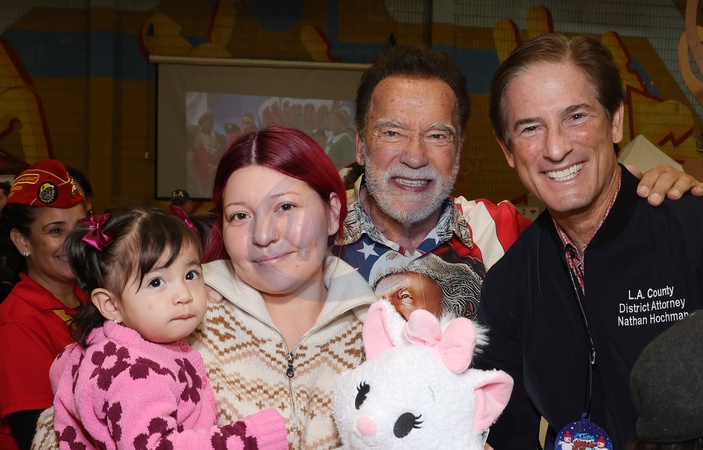 13 December 2025 . Los Angeles, California - District Attorney Nathan Hochman, Arnold Schwarzenegger, Sugar Ray Leonard, At THE 44th Annual "Miracle on 1st Street” Christmas Toy Giveaway held at Hollenbeck Youth Center in Los Angeles., Credit:Sadou Faye / Avalon