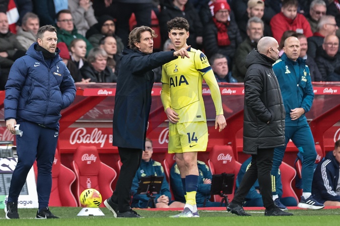 Thomas Frank manager of Tottenham Hotspur gives instruction to Archie Gray of Tottenham Hotspur during the Premier League match Nottingham Forest vs Tottenham Hotspur at City Ground, Nottingham, United Kingdom, 14th December 2025, Credit:Mark Cosgrove/News Images / Avalon