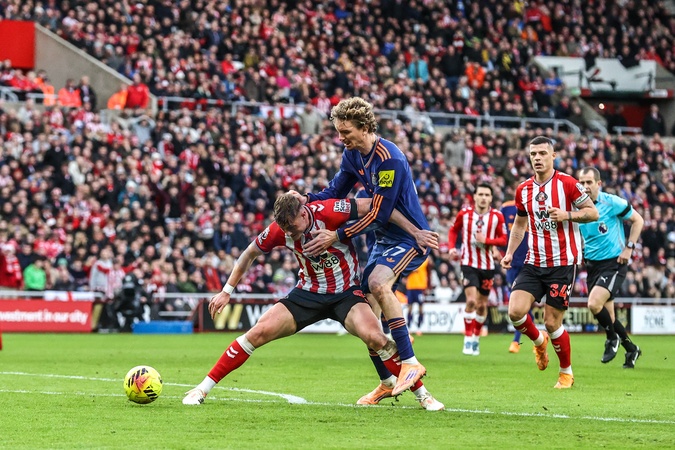Daniel Ballard of Sunderland holds off Nick Woltemade of Newcastle United during the Premier League match Sunderland vs Newcastle United at Stadium Of Light, Sunderland, United Kingdom, 14th December 2025, Credit:Ae Cosgrove/News Images / Avalon