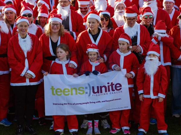 The Teens Unite "Santa Dash" sees over 400 santas run between Broxbourne and Hoddesdon in support of the charity. Teens Unite is the only organisation in the UK to provide ongoing support to 13-24 year old's during and after cancer, Hertfordshire, UK, 14 December 2025, Credit:Alex Day / Avalon