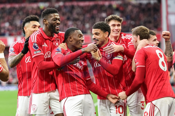 Callum Hudson-Odoi of Nottingham Forest celebrates his goal to make it 2-0 with team mates during the Premier League match Nottingham Forest vs Tottenham Hotspur at City Ground, Nottingham, United Kingdom, 14th December 2025, Credit:Mark Cosgrove/News Images / Avalon