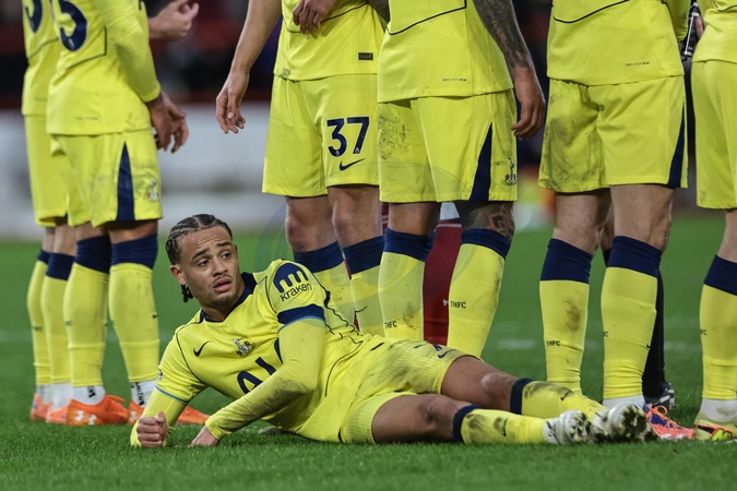 Xavi Simons of Tottenham Hotspur lays on the floor for a Forest freekick during the Premier League match Nottingham Forest vs Tottenham Hotspur at City Ground, Nottingham, United Kingdom, 14th December 2025, Credit:Mark Cosgrove/News Images / Avalon