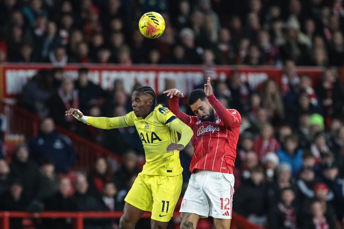 Mathys Tel of Tottenham Hotspur and Douglas Luiz of Nottingham Forest battle for the ball during the Premier League match Nottingham Forest vs Tottenham Hotspur at City Ground, Nottingham, United Kingdom, 14th December 2025, Credit:Mark Cosgrove/News Images / Avalon