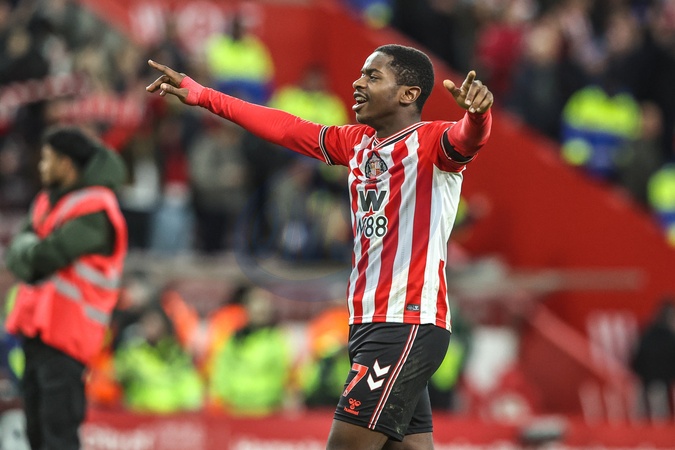 Noah Sadiki of Sunderland applauds the fans after the game during the Premier League match Sunderland vs Newcastle United at Stadium Of Light, Sunderland, United Kingdom, 14th December 2025, Credit:Ae Cosgrove/News Images / Avalon