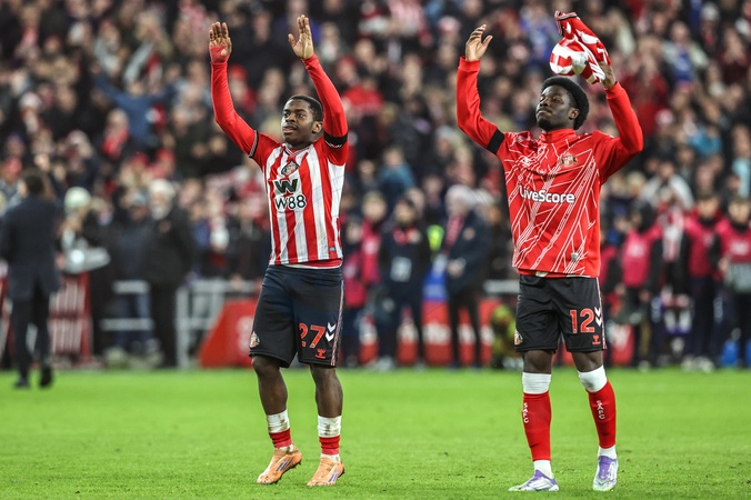 Noah Sadiki of Sunderland and Eliezer Mayenda of Sunderland celebrate the win during the Premier League match Sunderland vs Newcastle United at Stadium Of Light, Sunderland, United Kingdom, 14th December 2025, Credit:Ae Cosgrove/News Images / Avalon