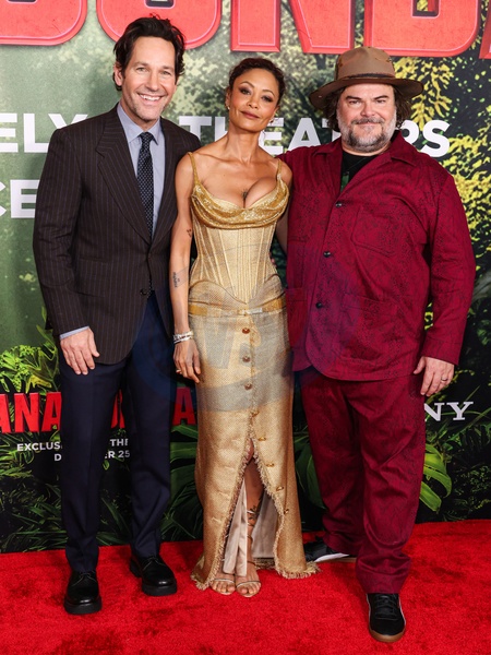 LOS ANGELES, CALIFORNIA, USA - DECEMBER 13: American actor, producer, and screenwriter Paul Rudd, English actress and activist Thandiwe Newton and American actor, comedian and musician Jack Black arrive at the World Premiere Of Columbia Pictures' 'Anaconda' held at The United Theater on Broadway at STILE Downtown Los Angeles by Kasa on December 13, 2025 in Los Angeles, California, United States., Credit:Xavier Collin / Avalon