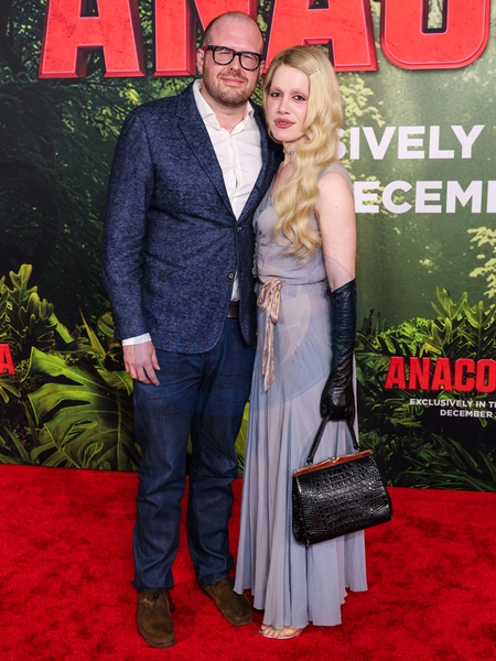 LOS ANGELES, CALIFORNIA, USA - DECEMBER 13: Evan Daugherty and Esther Harrington arrive at the World Premiere Of Columbia Pictures' 'Anaconda' held at The United Theater on Broadway at STILE Downtown Los Angeles by Kasa on December 13, 2025 in Los Angeles, California, United States., Credit:Xavier Collin / Avalon