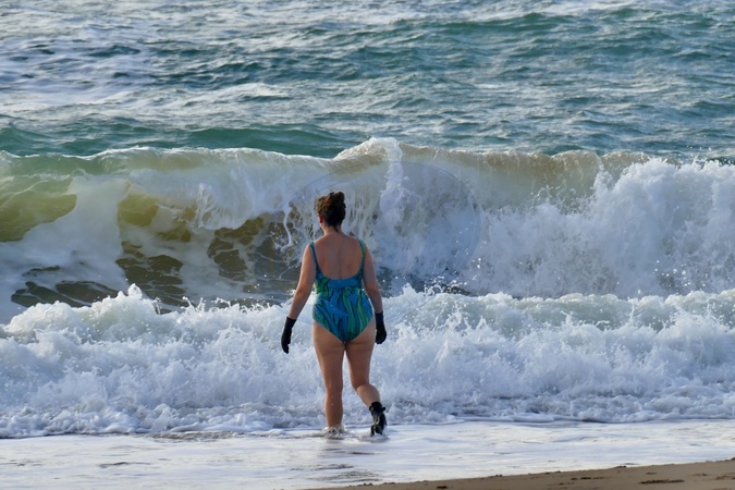 Wild swimmers take to the sea on a cold and blustery day by the coast, Credit:Geoffrey Swaine / Avalon