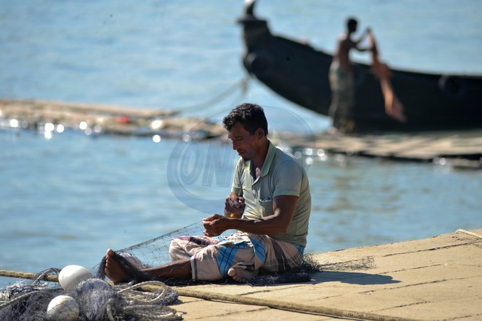 Chattogram, Bangladesh — Fisherman mends and repairs his fishing net on the bank of the Karnaphuli River in Chattogram. Net mending is a routine but essential task for riverine fishermen, reflecting the enduring dependence of coastal communities on traditional fishing practices for their livelihoods., Credit:Md Rafayat Haque Khan / Avalon