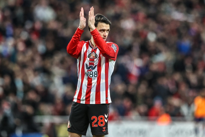 Enzo Le Fee of Sunderland applauds his team as they pressure the Newcastle defence during the Premier League match Sunderland vs Newcastle United at Stadium Of Light, Sunderland, United Kingdom, 14th December 2025, Credit:Ae Cosgrove/News Images / Avalon