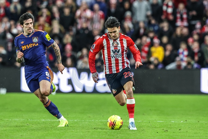 Enzo Le Fee of Sunderland breaks with the ball under pressure from Sandro Tonali of Newcastle United during the Premier League match Sunderland vs Newcastle United at Stadium Of Light, Sunderland, United Kingdom, 14th December 2025, Credit:Ae Cosgrove/News Images / Avalon