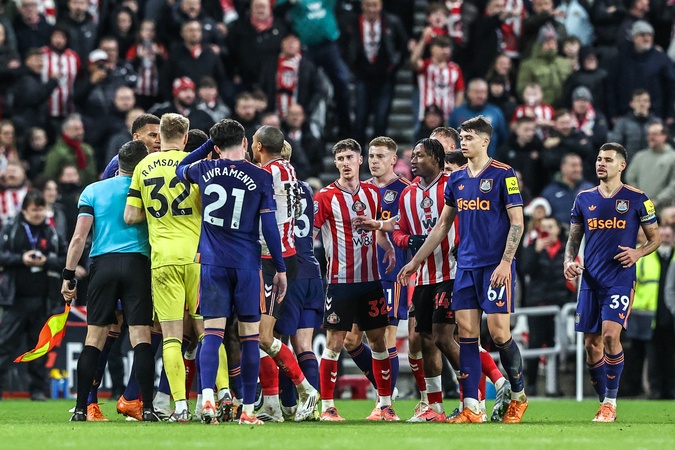 An altercation between the players late in the second half during the Premier League match Sunderland vs Newcastle United at Stadium Of Light, Sunderland, United Kingdom, 14th December 2025, Credit:Ae Cosgrove/News Images / Avalon