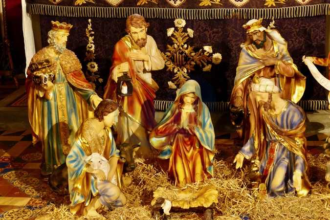 A traditional nativity scene in St. Andrews Church. The traditional nativity story tells of Mary and Joseph traveling to Bethlehem for a Roman census, where no room was available at the inn, so Jesus was born in a stable and laid in a manger. Shepherds, guided by angels, and later, Wise Men (Magi) following a star, visited the baby, bringing gifts like gold, frankincense, and myrrh, while Joseph was warned in dreams to flee to Egypt to escape King Herod's jealousy. The traditional nativity scene's history begins with St. Francis of Assisi staging the first living nativity in Greccio, Italy, in 1223, using real people and animals to convey the humility of Christ's birth, a practice that spread quickly. It evolved from live enactments to static displays with figures, Credit:Geoffrey Swaine / Avalon