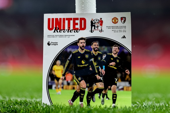 Bruno Fernandes of Manchester United on the front cover of todays official match day program during the Premier League match Manchester United vs Bournemouth at Old Trafford, Manchester, United Kingdom, 15th December 2025, Credit:Mark Cosgrove/News Images / Avalon