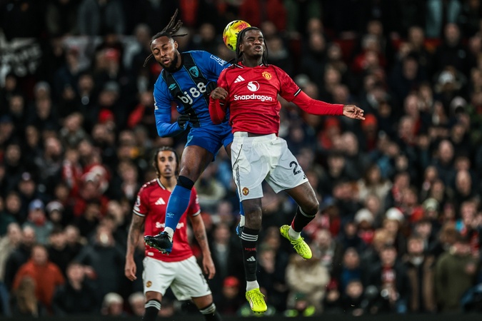 Ayden Heaven of Manchester Untied and Antoine Semenyo of Bournemouth battle for the ball during the Premier League match Manchester United vs Bournemouth at Old Trafford, Manchester, United Kingdom, 15th December 2025, Credit:Mark Cosgrove/News Images / Avalon