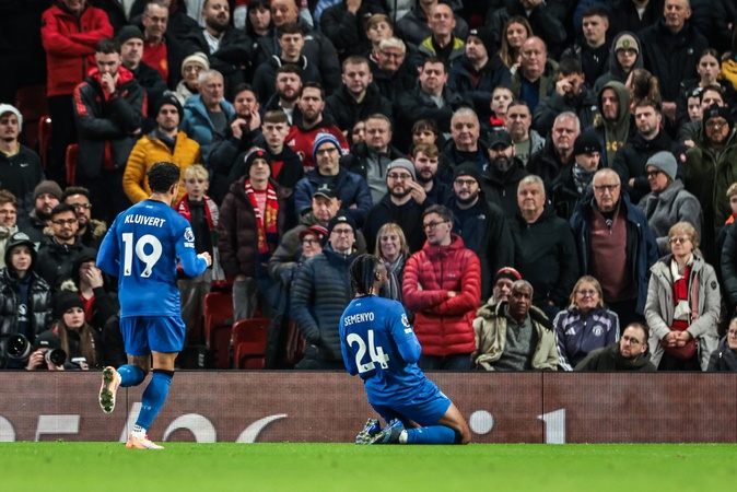 Antoine Semenyo of Bournemouth celebrates his goal to make it 1-1 during the Premier League match Manchester United vs Bournemouth at Old Trafford, Manchester, United Kingdom, 15th December 2025, Credit:Mark Cosgrove/News Images / Avalon
