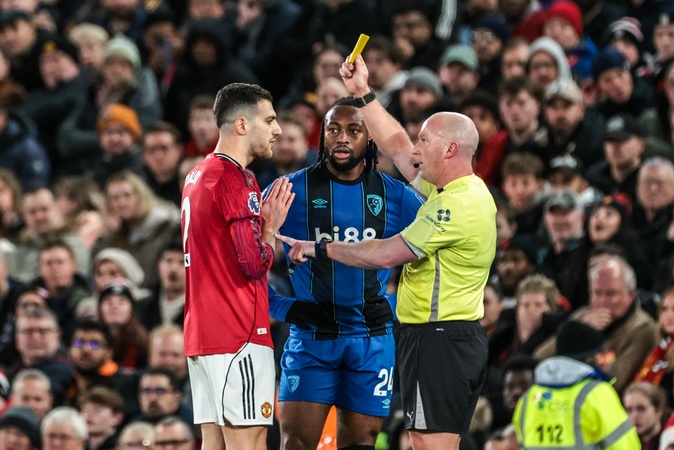 Referee Simon Hooper gives a yellow card to Diogo Dalot of Manchester Untied and Antoine Semenyo of Bournemouth during the Premier League match Manchester United vs Bournemouth at Old Trafford, Manchester, United Kingdom, 15th December 2025, Credit:Mark Cosgrove/News Images / Avalon