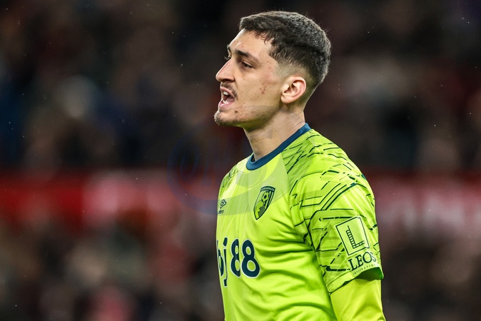 Bournemouth goalkeeper Djordje Petrovic reacts during the Premier League match Manchester United vs Bournemouth at Old Trafford, Manchester, United Kingdom, 15th December 2025, Credit:Mark Cosgrove/News Images / Avalon