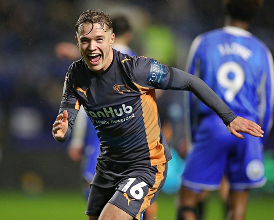 Liam Thompson of Derby County celebrates his goal during the Sky Bet Championship match Sheffield Wednesday vs Derby County at Hillsborough, Sheffield, United Kingdom, 15th December 2025, Credit:Sam Eaden/News Images / Avalon